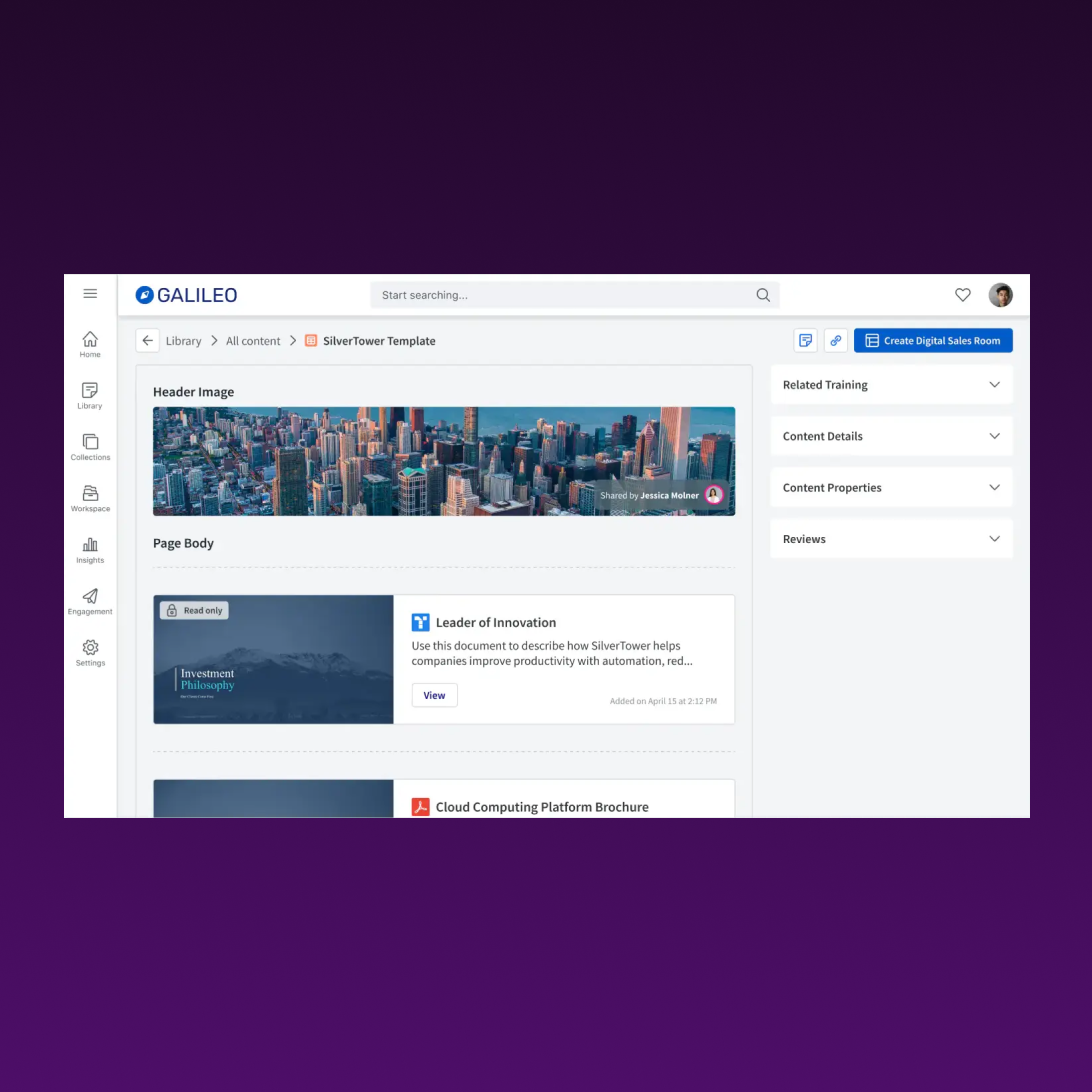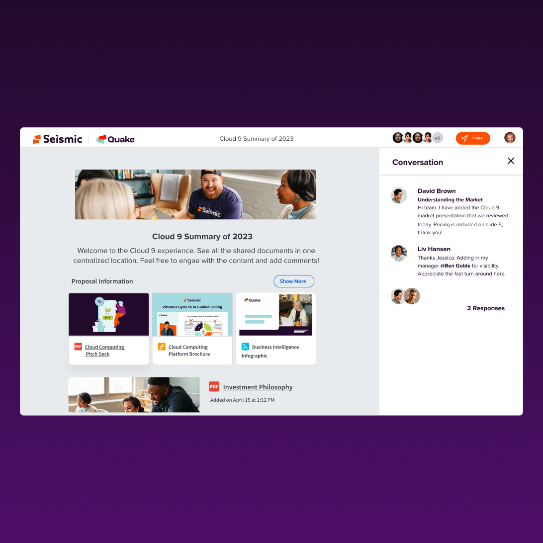 Empower reps to easily create best-in-class client experiences. Seismic’s Digital Sales Room features give marketing and enablement teams control over the branding, messaging, and content in a scalable way.
